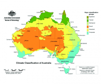 Le Nord de l’Australie (du Sud de Broome à Cairns) bénéficie d’un climat tropical, composé de deux saisons. La saison humide ou la “wet season" d’octobre à mars. Elle est caractérisée par une chaleur humide, accompagnée de pluies diluviennes d’un temps orageux. Il fait chaud, très chaud.. À l’inverse, la saison sèche, appelée Dry, s’étale d’avril à septembre : les températures sont chaudes mais supportables, et le temps sec. C'est la haute saison touristique. Sinon, le centre du pays (outback) est désertique. Il a lui même trois types de climat. D'ordre général, il peut geler les nuits d'hiver et la journée faire chaud. en été ce sont des journées très chaudes qui vous attendent avec des nuits humides